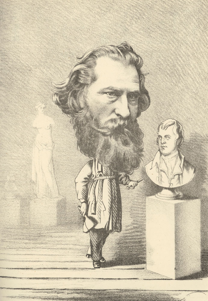 Ewing was born in Birmingham and worked in London and Liverpool before moving to Glasgow in 1859. His works include busts of Lord Clyde and Sir Daniel Macnee, and monuments to James Jamieson and David Prince Miller in the Necropolis. The bronze statue of Robert Burns depicted by The Bailie’s caricaturist in 1874 was unveiled in George Square on 25 January 1877. 10,000 people are said to have formed a procession from Glasgow Green to attend the unveiling, with as many as 30,000 lining the streets.