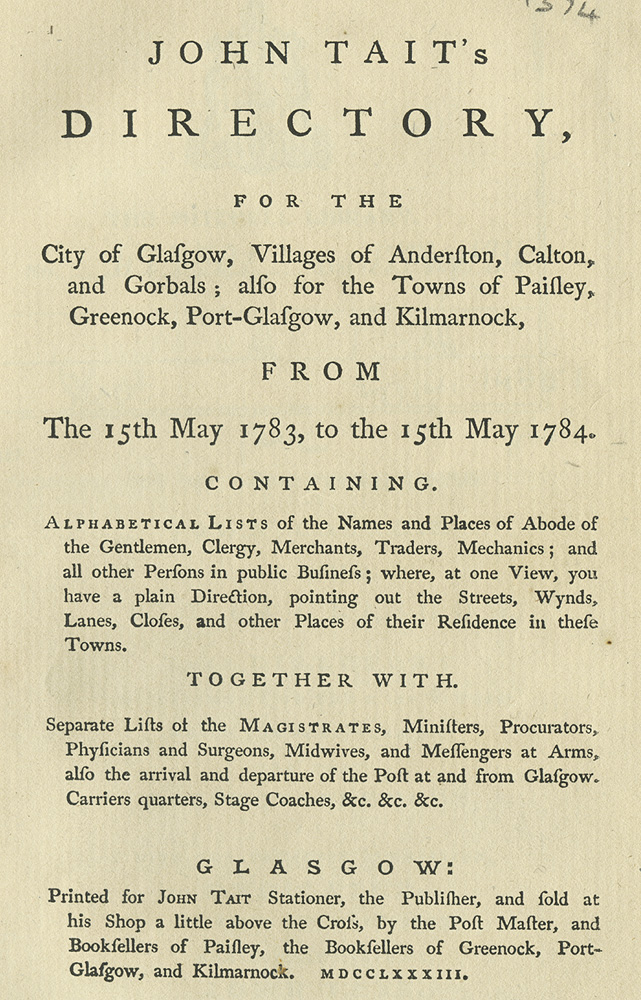 The first Glasgow directory was published in 1783 by John Tait. This image is taken from a facsimile reprint published in 1871 by Robert Forrester.