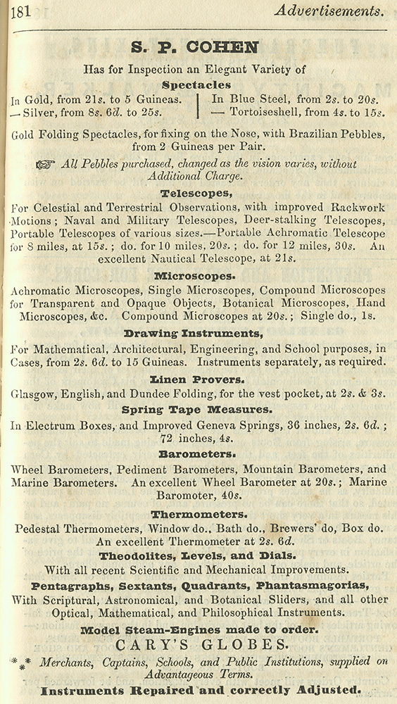 An advertisement from the Post Office Glasgow directory of 1845-1846 for S P Cohen. Cohen's business, originally conducted by A Abraham & Co, manufactured spectacles and optical and other scientific instruments at premises in Buchanan Street.