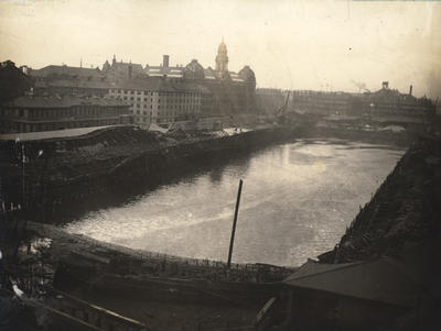 A photograph taken in June 1914 showing fire damage to Kingston Dock, looking west towards the imposing range of Scottish Co-Operative Wholesale Society offices and warehouses (centre) on Morrison Street.