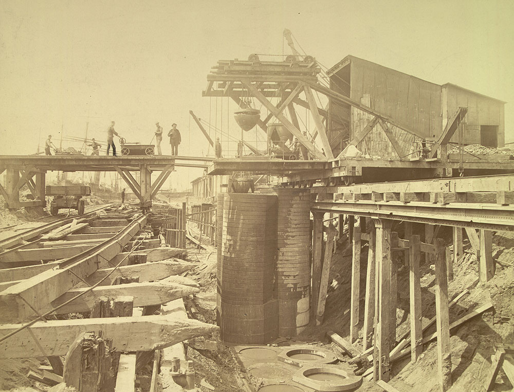 A photograph showing a cylinder group being sunk to form the foundation of the riverside quay wall of Queen's Dock, June 1878. This method of construction was adopted when conventional wooden pile foundations were inappropriate in silt or soft ground
