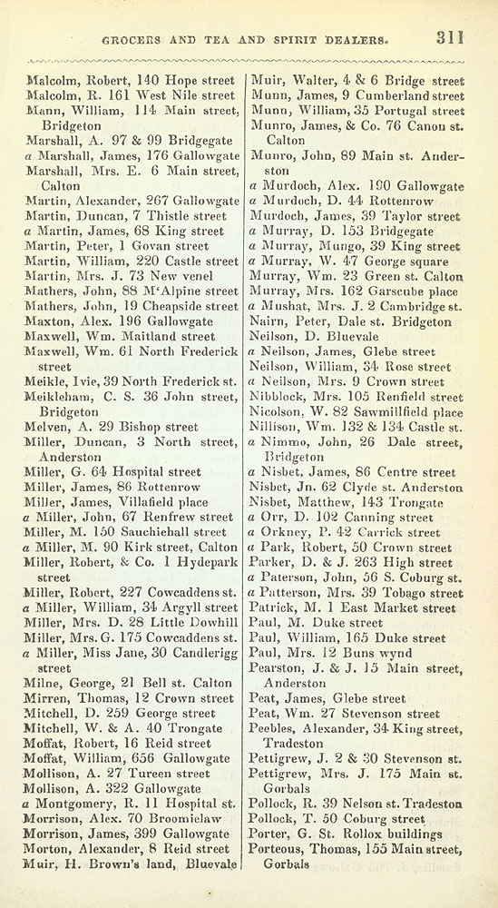 Post Office Glasgow Directory 1841-1842, Professions Index, grocers and tea and spirit dealers. The Professions Index appears at the end of the directory, and lists the names and addresses of members of professions, alphabetically, according to profession, from accountants to zincographic printers.