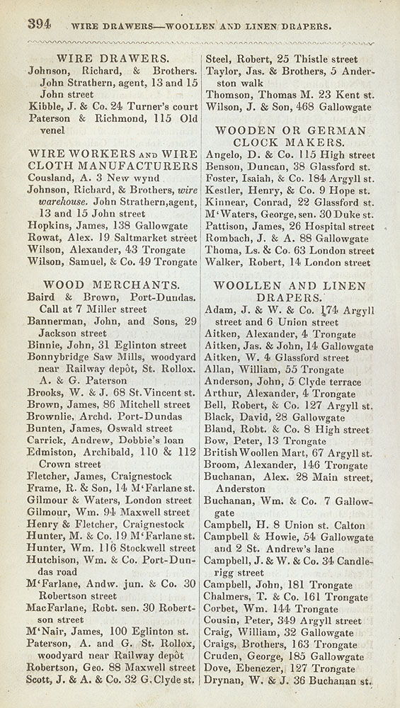 Post Office Glasgow Directory 1841-1842, Professions Index, wire drawers-woollen and linen drapers. The Professions Index appears at the end of the directory, and lists the names and addresses of members of professions, alphabetically, according to profession, from accountants to zincographic printers.