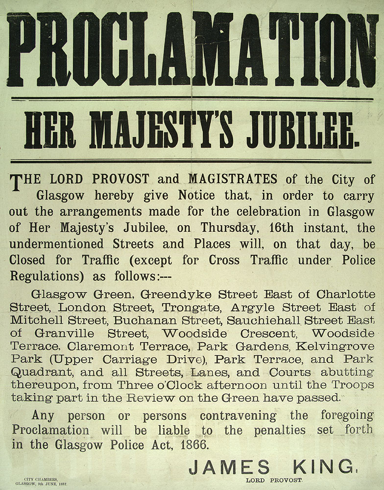 Glasgow Cathedral, Glasgow Green, jubilees, Lord Provosts, McLellan Galleries, military reviews, posters, proclamations, Queen Victoria's Jubilee, St Andrew's Halls, Town Clerk's Department