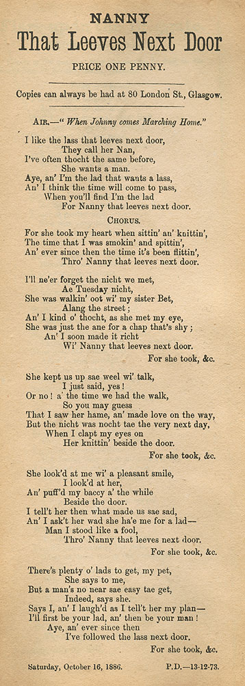 "Nanny That Leeves Next Door", a song preserved in a scrapbook entitled Old Glasgow Street Songs etc, 1850 which is held at the Mitchell Library.