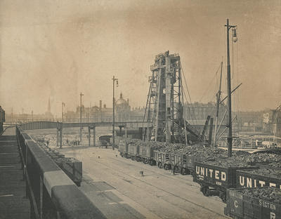 Each fully-laden coal wagon (right) was attached in turn to the hoist at quay level, and raised to a height of 50 feet. The wagon's contents were then tipped through a chute into the ship's bunker below. The empty wagon was placed on a raised track (in the centre of the photograph) and the force of gravity returned it to the sidings on the left.