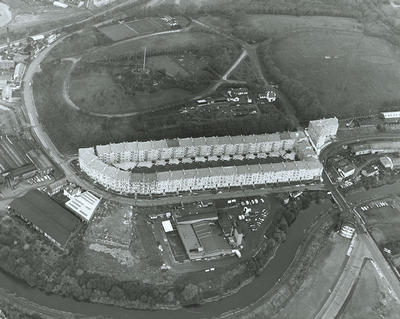 An aerial view of the £3m rehabilitation development at Murano Street and Benview Street, 1978. The space between the Murano Street tenements and the Glasgow Branch of the Forth and Clyde Canal is occupied by McGhee & Sons' bakery and William Teacher & Sons' whisky distribution plant. Facing Benview Street is Ruchill Park, with the flagpole at its summit.