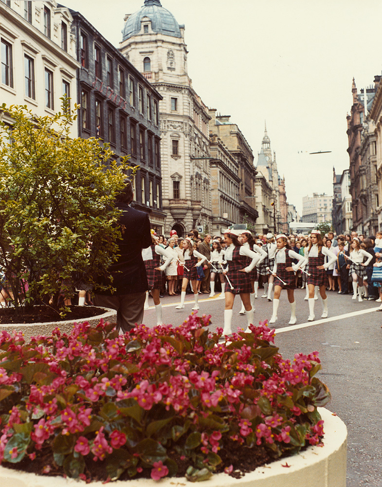Tartan-clad dancing girls at the opening of the pedestrian area in Buchanan Street in 1972.