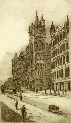 View by Edwin Law (c 1900) of the multi-turreted Christian Institute on Bothwell Street. The building housed a YMCA, a restaurant, a Bible Training Institute, sitting rooms, libraries and other facilities for members of the Evangelical movement in the city. It was built in 1879, extended in 1896 and demolished in 1980.