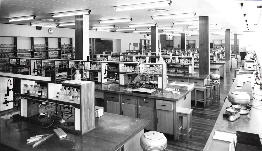 The Davidson Building was constructed to house the Biochemistry Department, and as such was equipped with the latest facilities for teaching and research. This picture was taken shortly after opening and shows one of the laboratories. Each workbench has ample storage for instruments, a sink, bunsen burners and other equipment needed for conducting experiments. It is spacious enough to accommodate large classes and the windows on the outside wall to the right allow large amounts of natural light into the room.