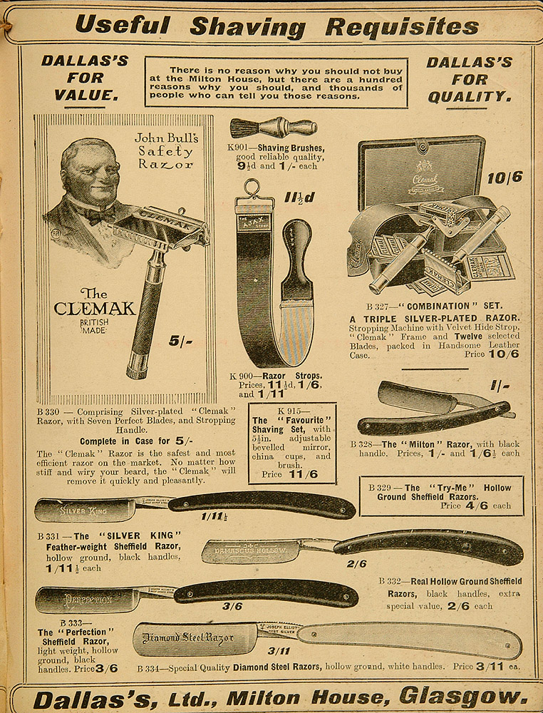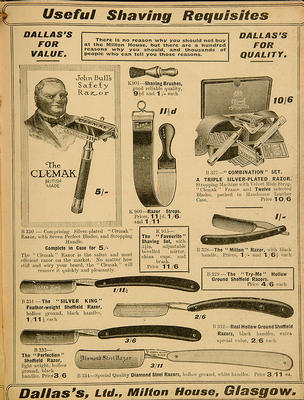 cut-throat razors, Dallas's, department stores, mail order catalogues, Milton House, razor straps, razors, safety razors, shaving brushes, shaving equipment, shopping, shops, toiletries