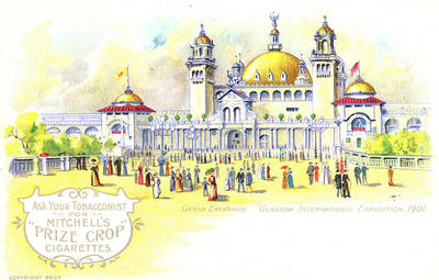advertisements, cigarettes, exhibitions, Grand Entrance, International Exhibition, 1901, Kelvingrove Park, Mitchell's "Prize Crop" Cigarettes, parks, postcards, tobacco industry, tobacco merchants
