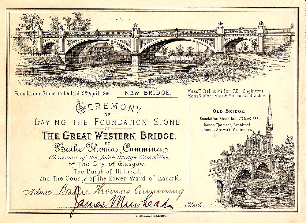 By the late 19th century it was becoming clear that the bridge built at Kelvinbridge in 1841 could not cope with the ever increasing flow of traffic along Great Western Road. Construction on the new Great Western Bridge started in 1889 and the cornerstone was laid the following year. The bridge was completed in 1891. The engineers responsible for the project were Bell & Miller, while William Arrol & Co supplied the steelwork.