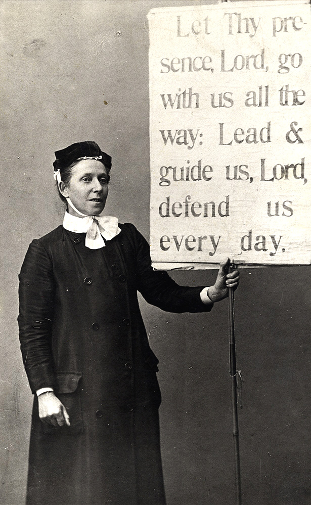 Jean Cunningham with religious placard, c 1913. Cunningham was a howdie, the Scots word for a midwife. She was a very religious woman, and when she wasn't delivering babies she delivered her Christian message in the streets of the city's East End.