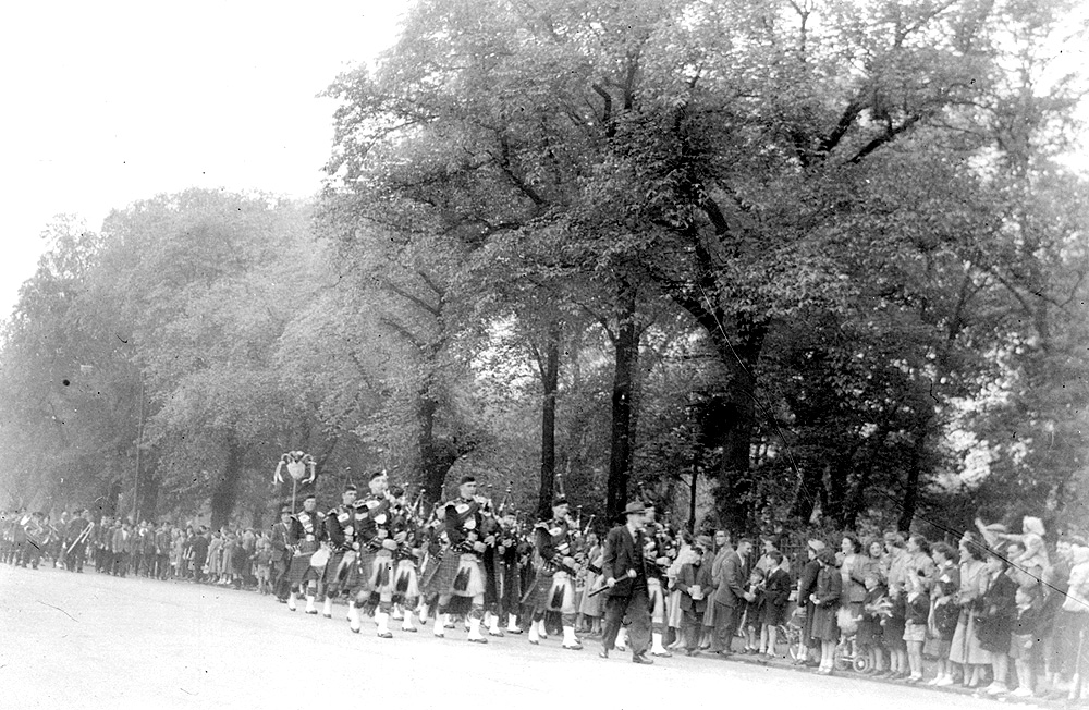 The Govan Fair Procession, led by the Govan Police Pipe Band, on Langlands Road, perhaps 1940s or 1950s. The famous sheep's (more accurately, ram's) head is borne aloft behind the band.