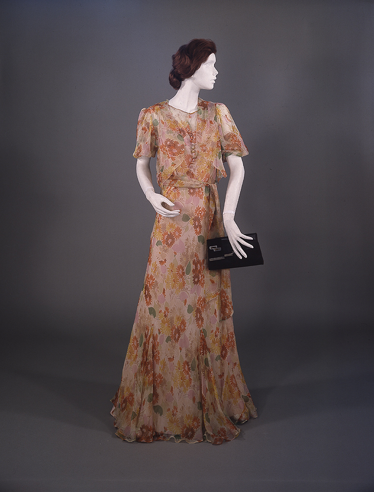 A printed silk chiffon afternoon dress and bolero jacket stocked by Murielle's of Sauchiehall Street, c 1934.
