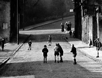Sunday morning in the Drygate, 1955. Boys are playing in the foreground, while further up the hill a group of men stand gossiping in the winter sunshine.