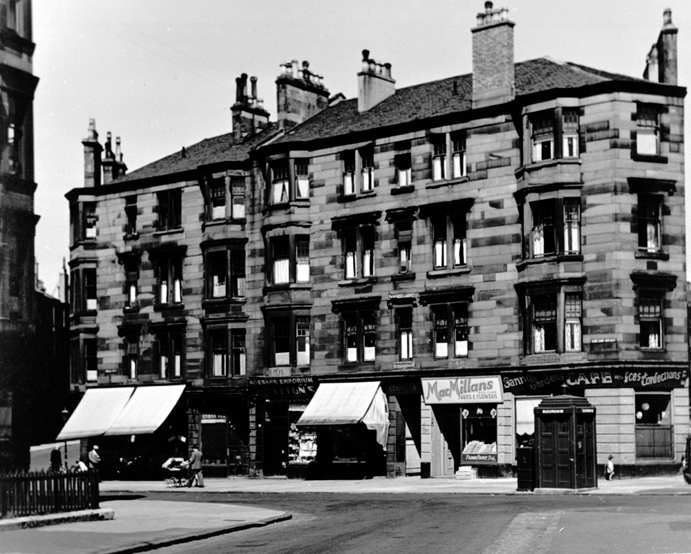 cafes, florists, flower shops, fruit shops, fruiterers, Glasgow Photographic Survey 1955, greengrocers, ice-cream shops, lace curtains, MacMillan's Fruit & Flowers, police boxes, prams, Roebank Emporium, Sannox Gardens Cafe, shops, streetscenes, tenements
