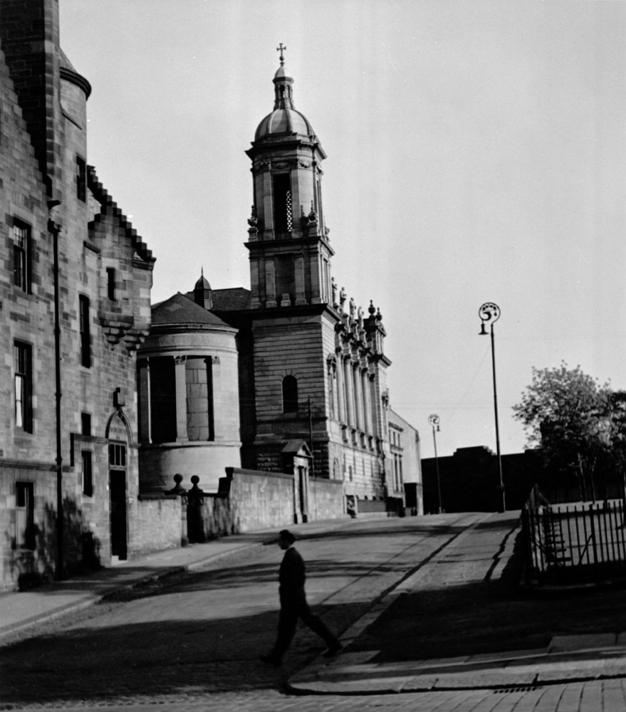 Barony North Church, Cathedral Square United Presbyterian Church, Church of Scotland, church towers, churches, cuploas, Duke Street Anti-Burgher Church, Duke Street United Presbyterian Church, Evangelical Assembly, Glasgow Evangelical Church, Glasgow Photographic Survey 1955, scultures, statues, street lights