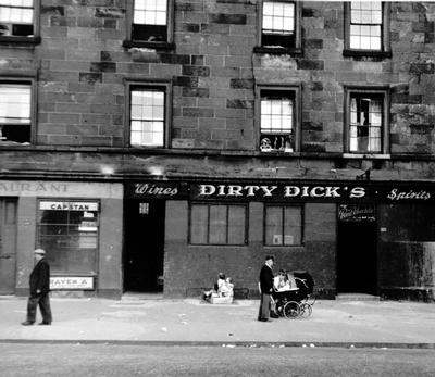 The pub was located in a tenement which was built in 1864. Its proximity to Glasgow Harbour made Dirty Dick's a favourite with dockers and sailors of all nationalities. The pub served tea and hot food in a addition to alcoholic refreshments, and accepted a variety of foreign currencies in payment. Dirty Dick's was also infamous as a drinking den for prostitutes. It is said that the women wrote the price on the soles of their shoes, putting their feet up on the tables when a potential customer approached. The pub was demolished in the 1960s.