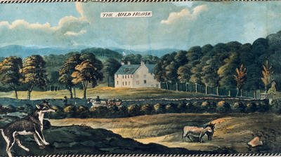 This watercolour was painted by an unknown artist for the Maxwell family and is one of a series showing views of the Pollok Estate c 1830. Auldhouse is depicted set back from the road amongst trees. A horse and cart travel along the road past cows grazing in the field in the foreground. The wolf in the left corner is a scrap stuck on the painting at a later date.