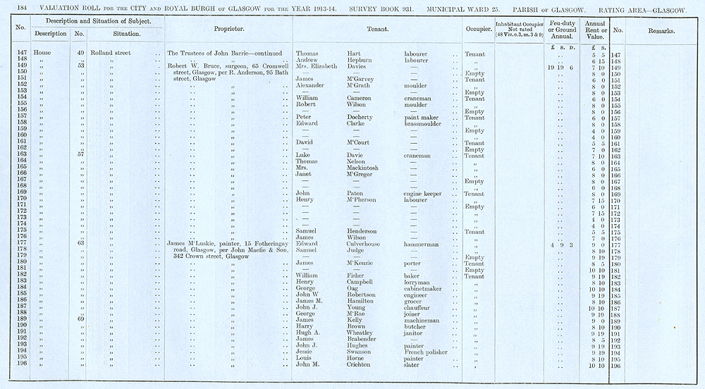 Glasgow Valuation Roll VR 1913-14, Ward 25, p184